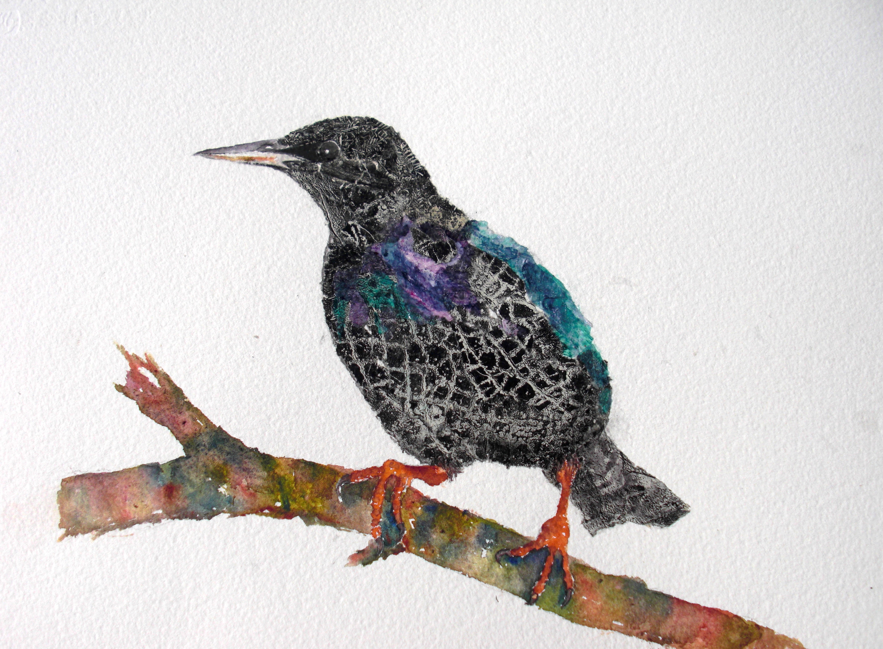 Annie Rice. Beccles. Protect Preserve The Starling. Collage Watercolour