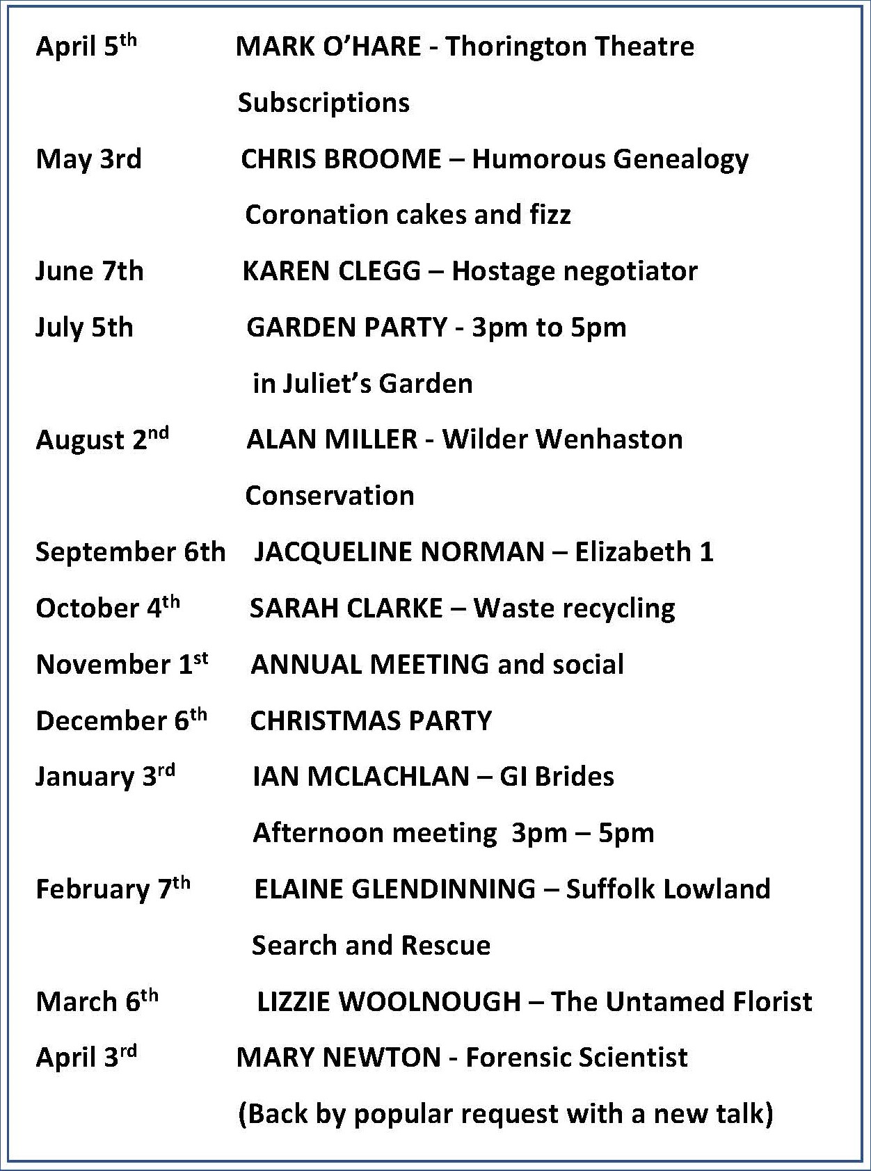 The Wenhaston Women's Institute Programme of Meetings